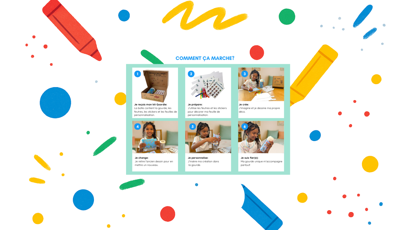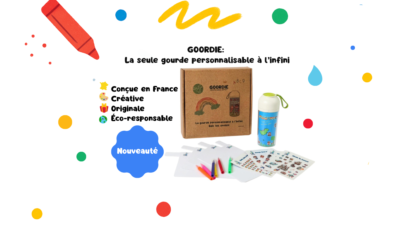 Goordie permet à chaque enfant de créer une gourde qui lui ressemble vraiment. Les feuilles de personnalisation et les stickers ont été conçus pour que chaque enfant puisse s’identifier, se projeter dans son imaginaire et même exprimer ce qu’il aimerait devenir plus tard. C’est un support ludique qui valorise leur personnalité et nourrit leur confiance en eux.